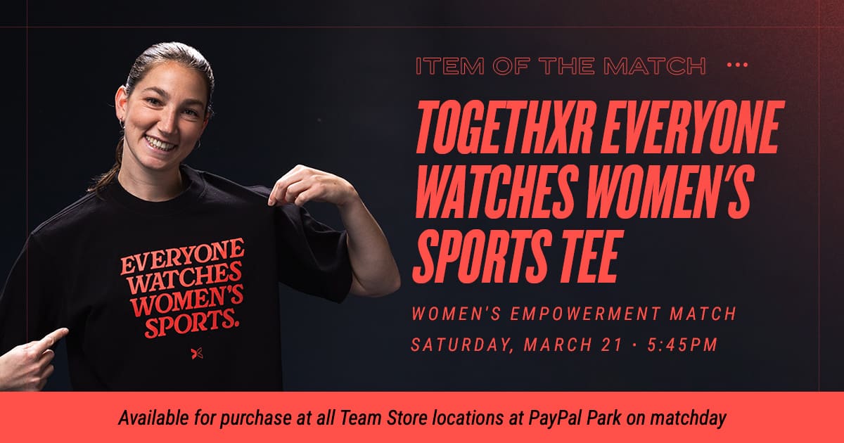 The limited-edition Togethxr Everyone Watches Women’s Sports Tee is available for purchase at all Team Store locations inside PayPal Park, exclusively on matchday.